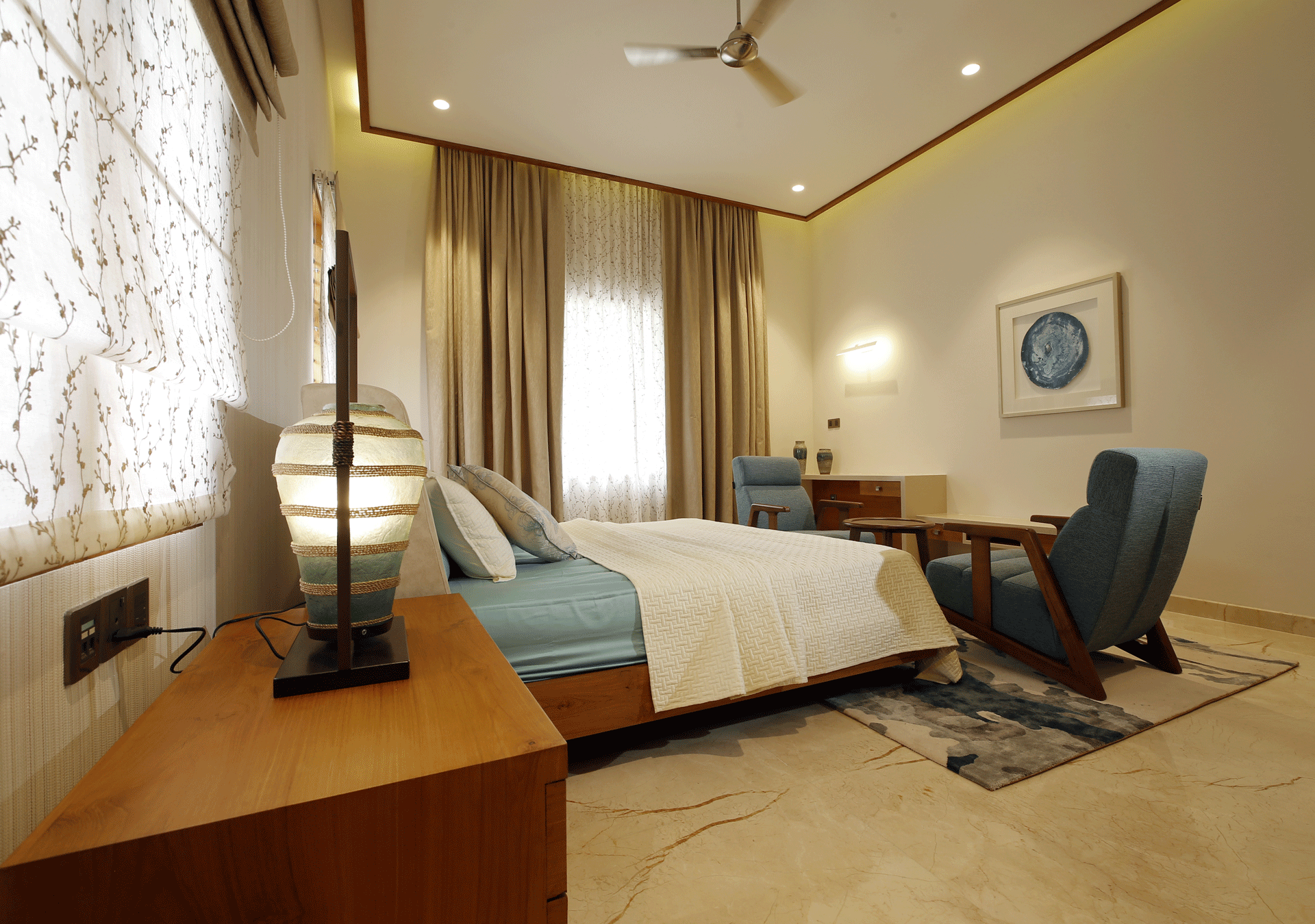 SSA designed this sprawling modern house, spread across acres of lush greenery. The residence boasts a stylish slant roof, long hallways, decorative plants, and a serene swimming pool. With luxurious wooden partitions, modern technology, and a stylish modular kitchen, the home perfectly balances contemporary design with functionality, offering an elegant and comfortable living space.