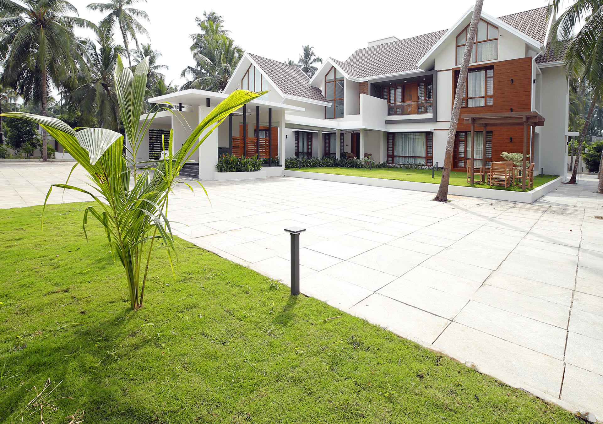 - Tiled Area Around the House: The surrounding tiled area elegantly separates the house from the green landscape, providing a clean, organized look.