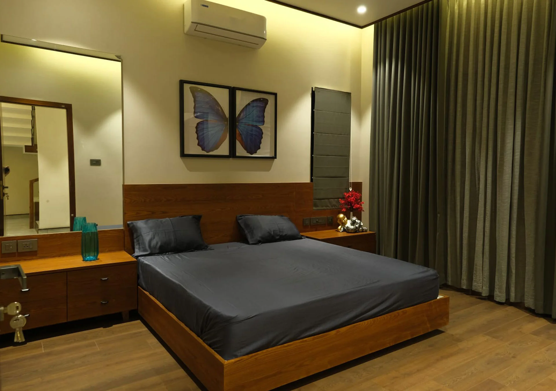 Our latest interior project is a masterclass in luxury and sophistication, bringing together the finest elements to create a stunning residential space. From the elegant wooden furniture to the floor-to-ceiling curtains that add depth and dimension, every detail is meticulously designed to inspire comfort and style. A standout feature is the modern wooden and glass staircase, complemented by false roofing with designer lights to bring a refined touch. The modular kitchen seamlessly integrates functionality with high-end aesthetics, while indoor decorative plants breathe life into the design, creating a perfect blend of nature and luxury.
