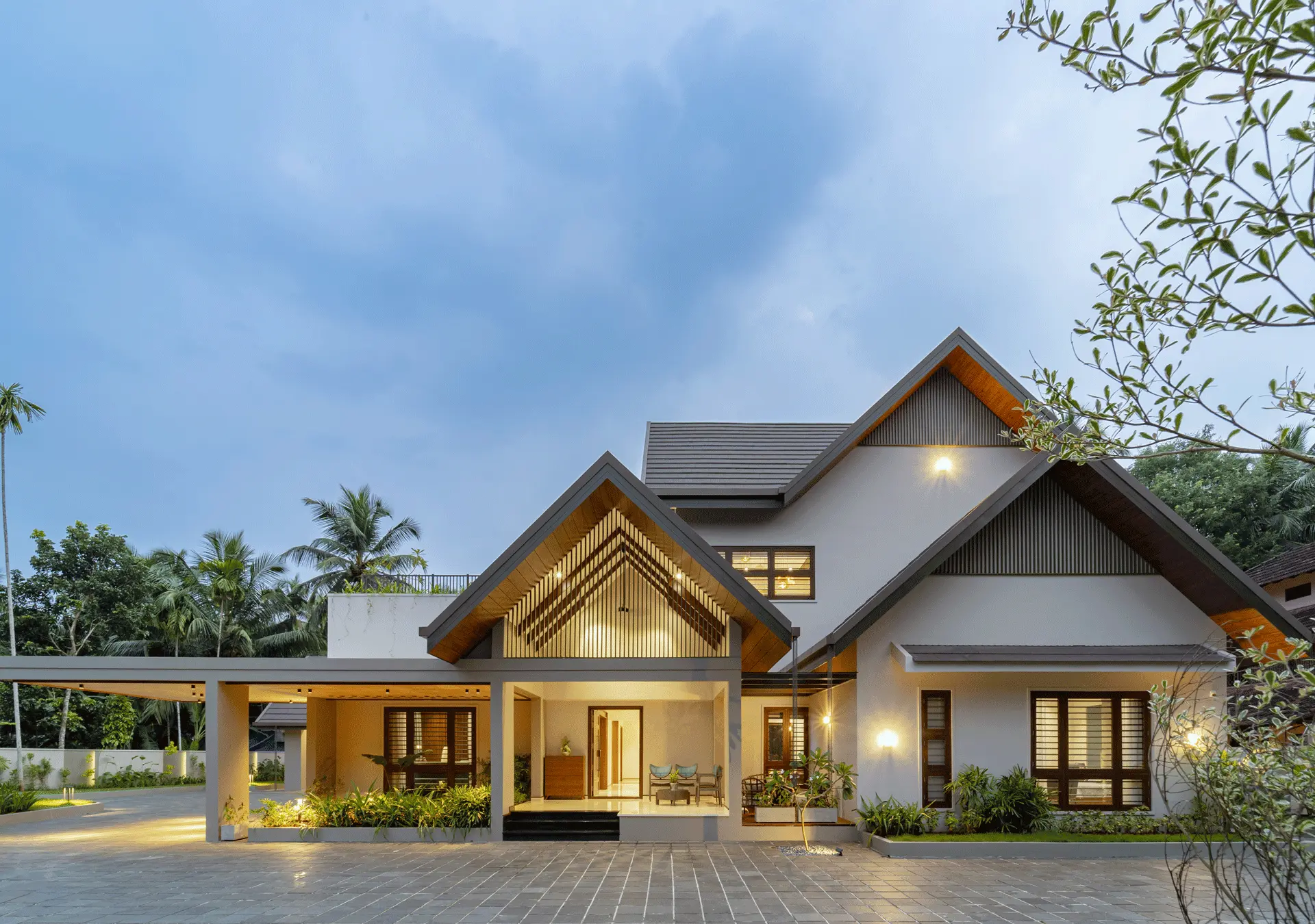 The client for the Residence at Pookottur wanted a luxurious home that reflects a blend of traditional and modern aesthetics. The house features elegant slant roofs, rich wooden interiors, and large glass windows that allow natural light to flood in. The surrounding area is meticulously landscaped with tiled pathways and curated greenery, enhancing the ambiance. With spacious rooms outfitted with modern amenities, the residence offers comfort, style, and a seamless connection with nature, making it an ideal family haven.
